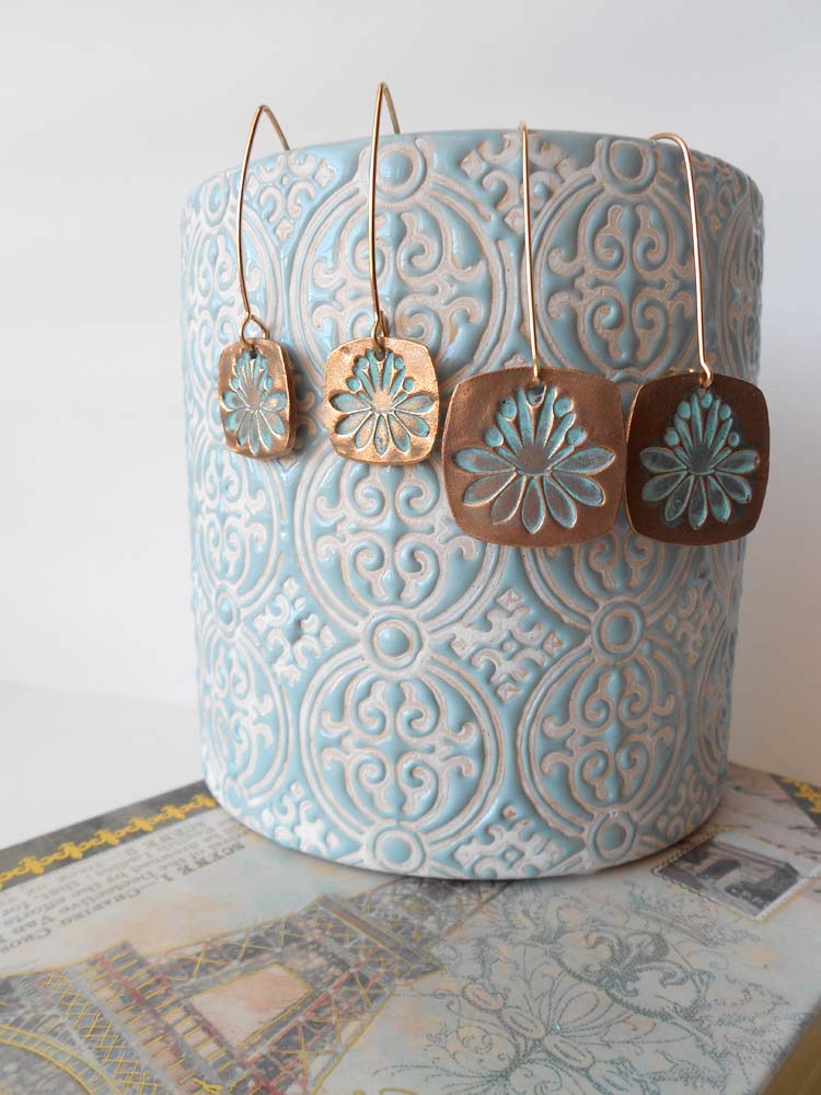The beautiful Lotus Earrings, large size. These earrings feature a medium/large solid bronze rounded edge square with a beautiful Lotus flower blossom in the center. Your choice of a long gold-filled hook or a short gold-plated ear hook. Beautiful!