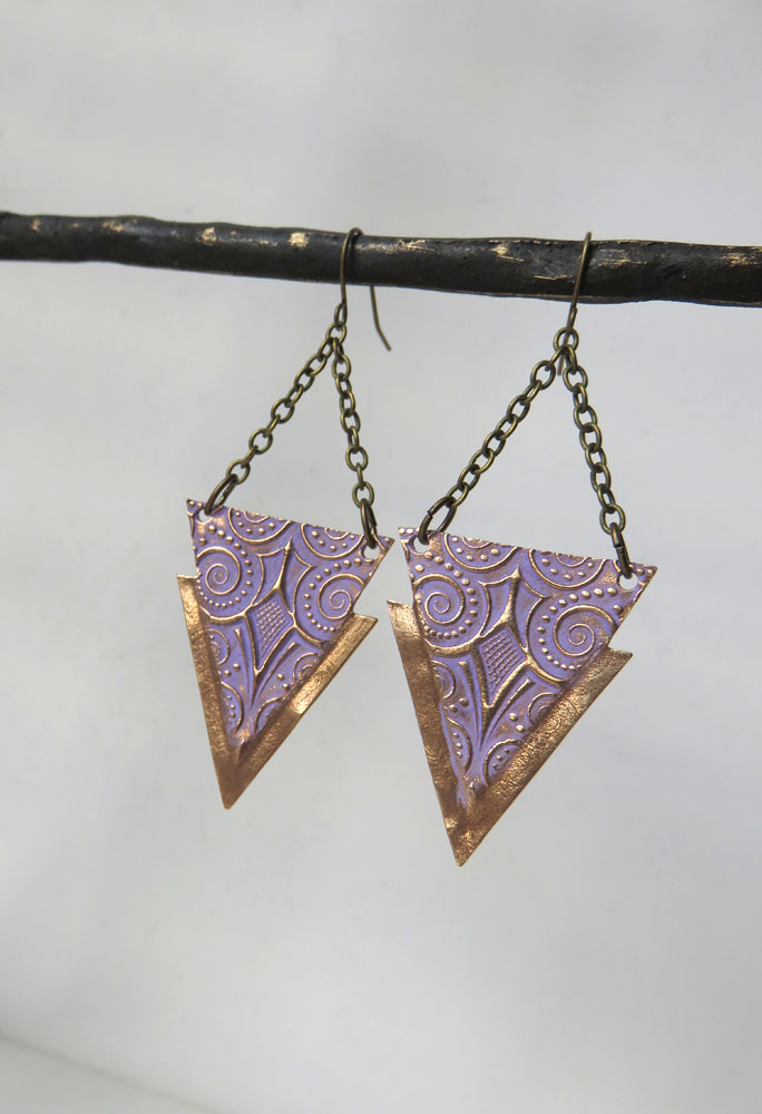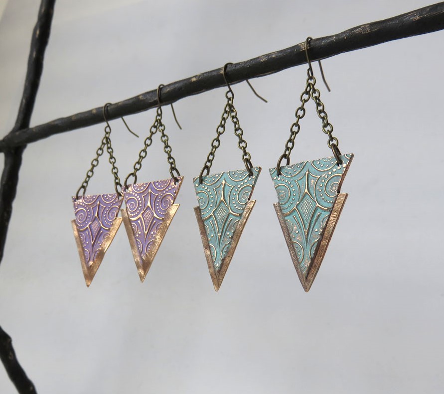 The stunning and unique Octavia Earrings. These earrings feature a medium/large size solid bronze spearhead piece with an intricate design. They hang from antiqued brass chain and a gold-plated ear hook. Stunning eye-catching earrings.